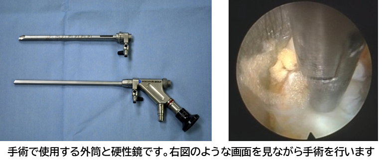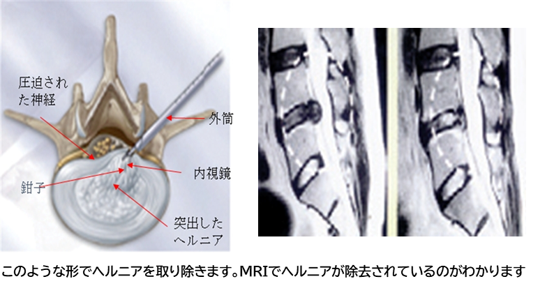 細い内視鏡や専用の高周波メスを用いることで、約8mmの皮膚切開で手術を行うことが可能になりました。ヘルニアの存在する場所の皮膚を切開し、 直径7mmの筒を挿入し、内視鏡で椎間板を観察しながら椎間板ヘルニアを摘出します。術前の患者様の症状によりますが、術後3時間から歩行開始し、 翌日退院が可能です。