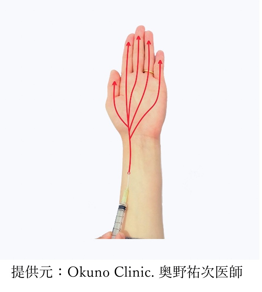 この治療は、一般的な注射針や点滴で使う細いチューブを用いて、手首や足首の動脈に直接薬を注入する方法です。